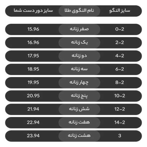 - برای انگشترهای پهن، نیم سایز بزرگتر انتخاب کنید.